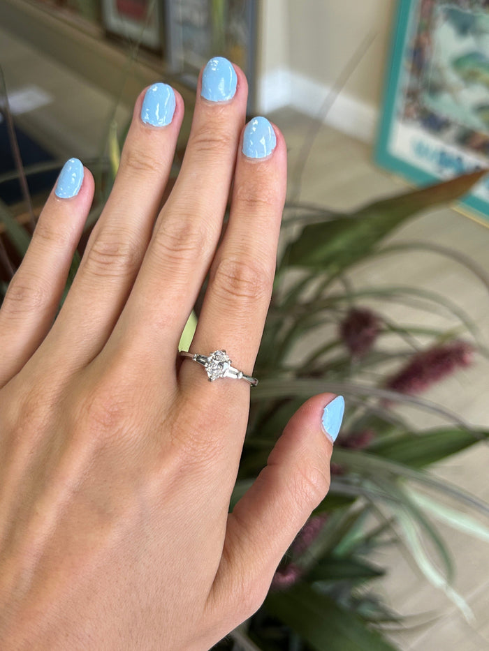 This exquisitely crafted 14kt white gold ring features a pear-cut diamond center stone with VS clarity and an H color rating, as well as two baguette side stones with VS clarity. The entire piece weighs approximately 5.5g and is sized 7, making it the perfect choice for your special day.