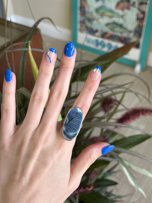 Sterling Silver Statement Ring with Large Blue Gray and Black Stone
